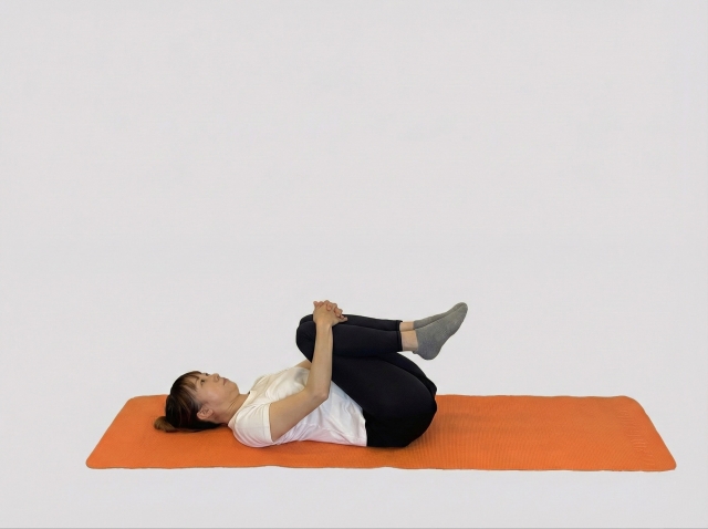 仰向けになり、片膝を胸に引き寄せ、反対側の足を伸ばします。ゆっくり呼吸をしながら20〜30秒キープします。左右それぞれ行いましょう。